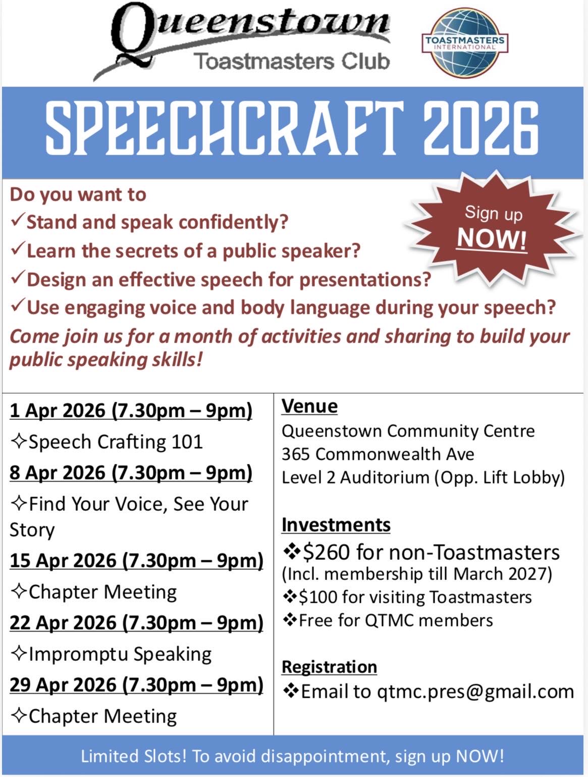 We have invited some of Singapore’s top speakers for this workshop. Limited time for discounted course fees with the hope that we can empower more of you to become better communicators.